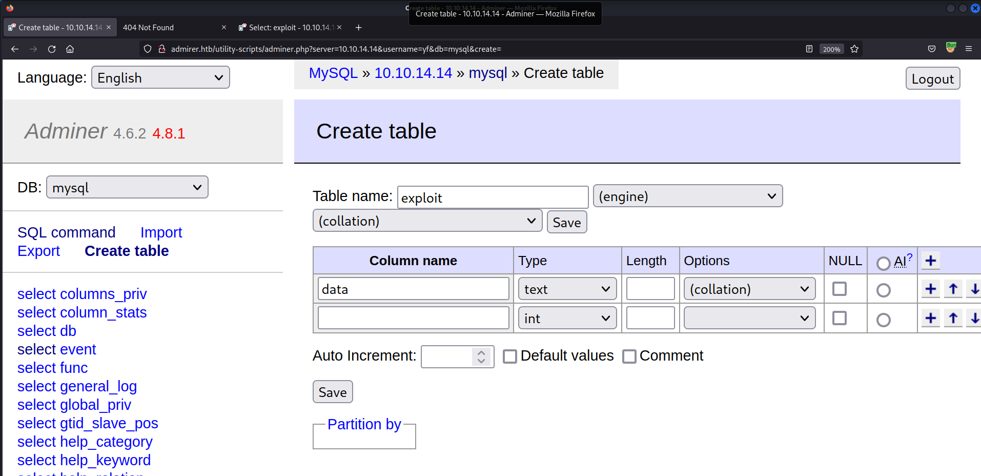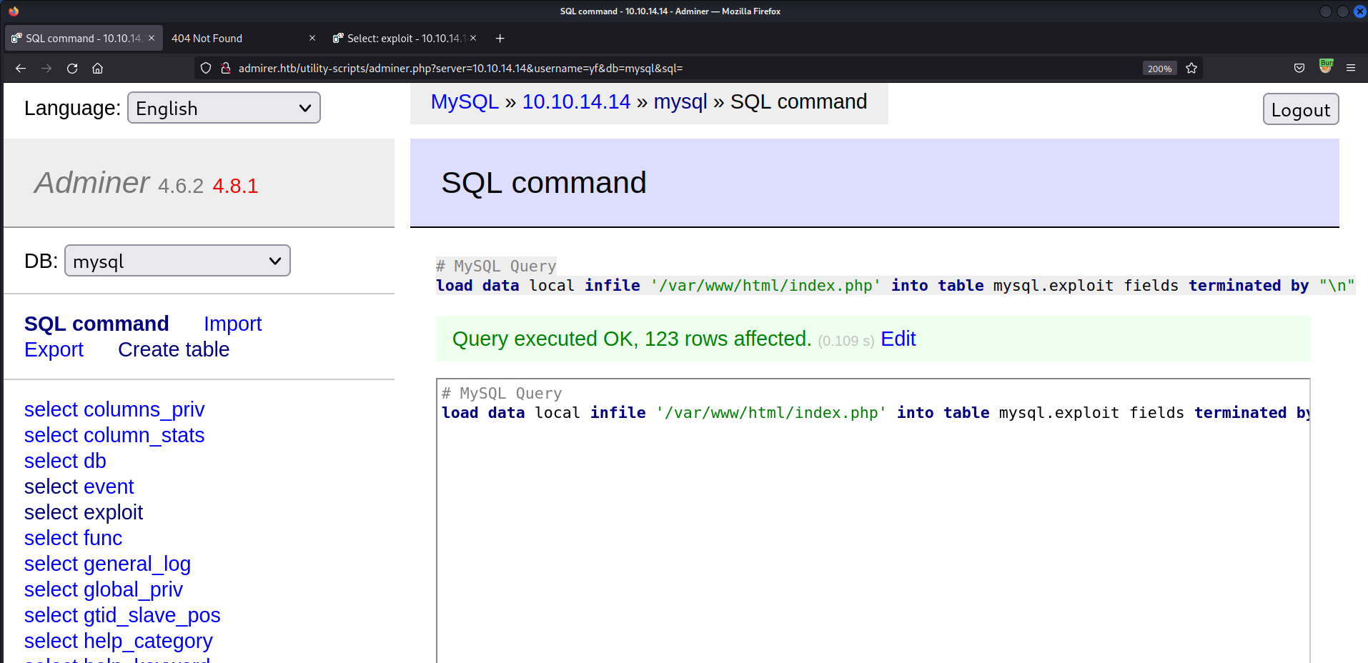 ┌──(root💀kali)-[~/htb/admirer/10.10.10.187] └─# ffuf -u http://admirer.htb/utility-scripts/FUZZ -w /usr/share/dirb/wordlists/big.txt -e '.txt,.php' info.php [Status: 200, Size: 83860, Words: 4033, Lines: 962, Duration: 43ms] info.php [Status: 200, Size: 83860, Words: 4033, Lines: 962, Duration: 48ms] adminer.php [Status: 200, Size: 4295, Words: 189, Lines: 52, Duration: 107ms] :: Progress: [13848/13848] :: Job [1/1] :: 1075 req/sec :: Duration: [0:00:12] :: Errors: 0 ::