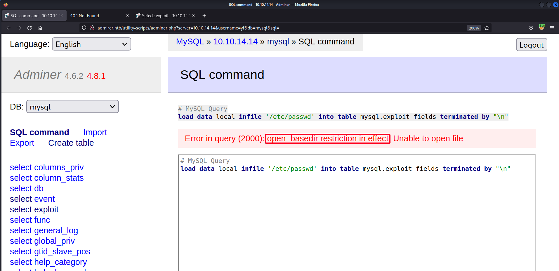 root@admirer:/var/www/html/utility-scripts# nano /etc/php/7.0/apache2/php.ini ... ; open_basedir, if set, limits all file operations to the defined directory ; and below. This directive makes most sense if used in a per-directory ; or per-virtualhost web server configuration file. ; http://php.net/open-basedir open_basedir = ...
