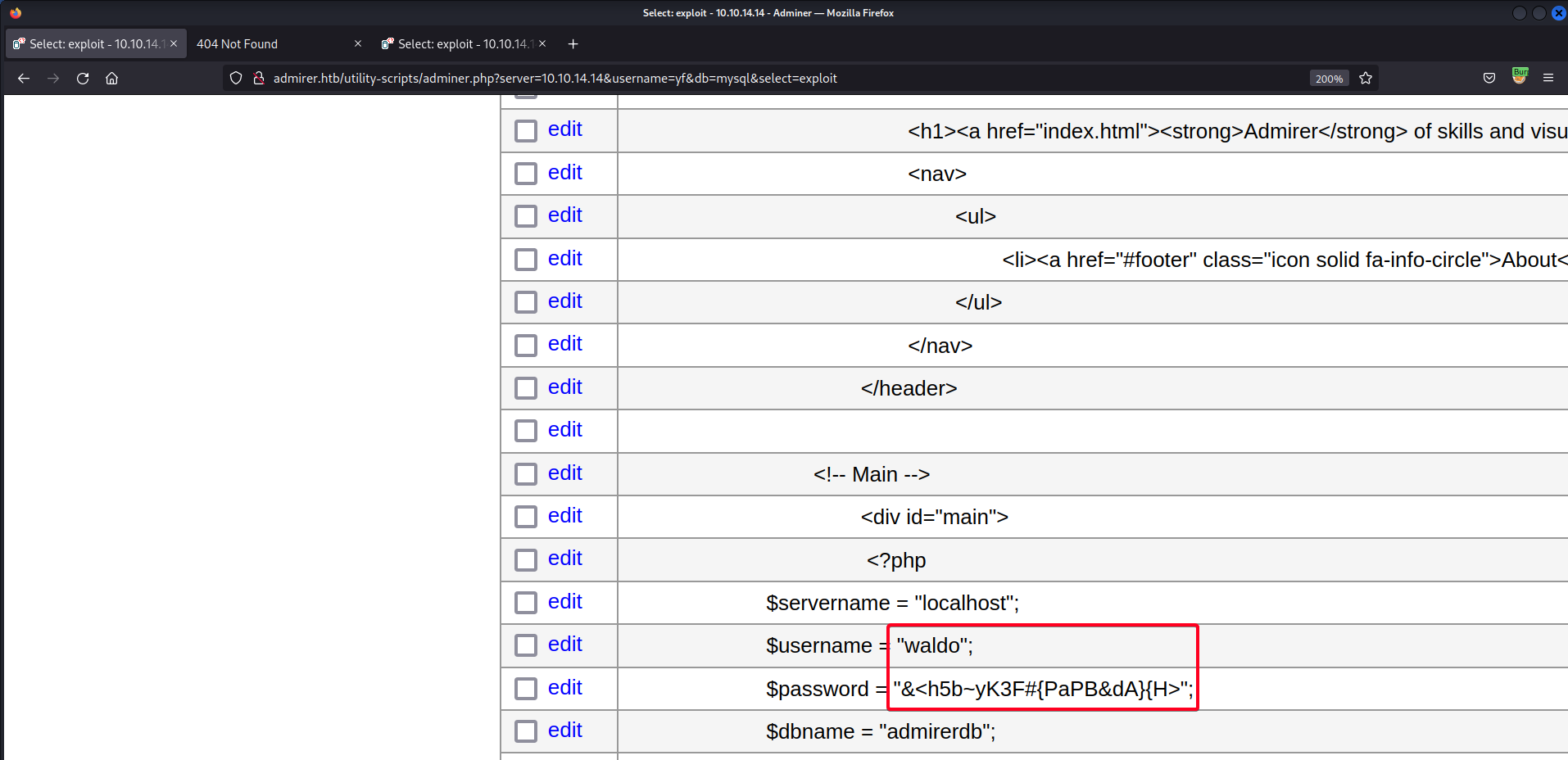 Directory enumerating utility-scripts directory, discovered adminer.php, adminer.php is susceptible to a file exfiltration vulnerability, allowing us to exfiltrate index.php containing MySQL credentials, allowing us to SSH as user waldo.