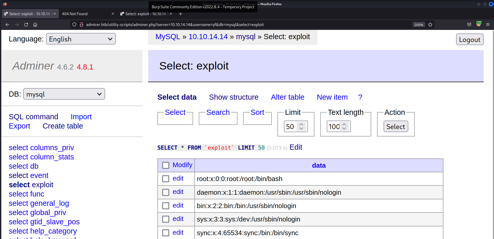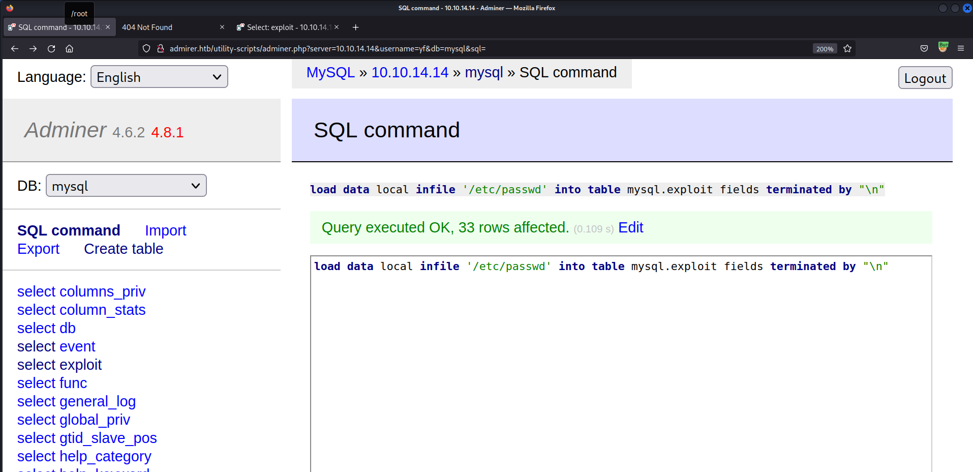 SQL Command, populate the exploit table w/ data we want to exfiltrate/etc/passwd1 2