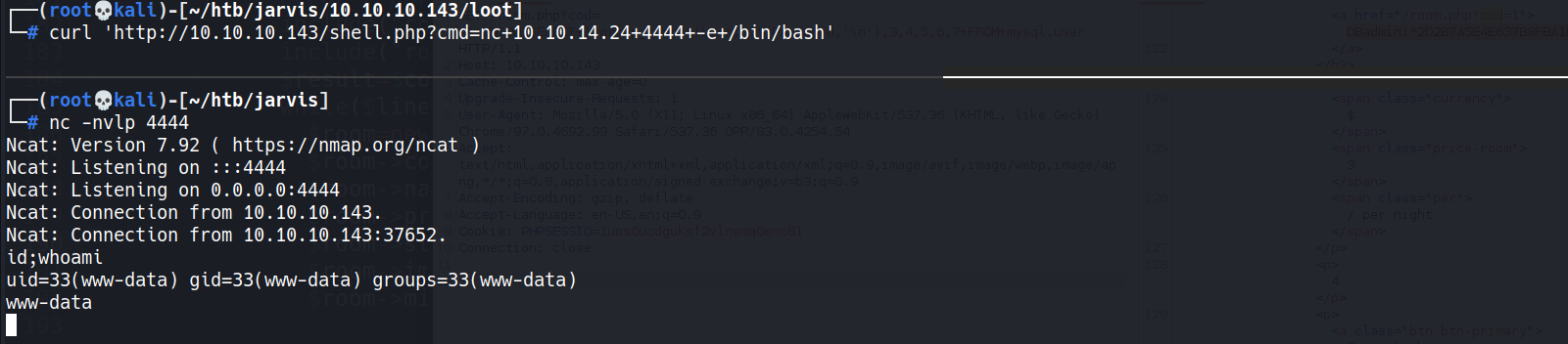┌──(root💀kali)-[~/htb/jarvis] └─# nc -nvlp 4444 Ncat: Version 7.92 ( https://nmap.org/ncat ) Ncat: Listening on :::4444 Ncat: Listening on 0.0.0.0:4444